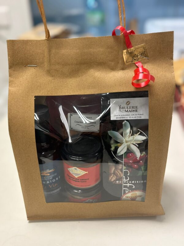 250ml vinaigre de cidre (la vinaigrerie), 180g crackers (Gipnx&co), 90g terrine de canard au cointreau et à l’orange, 90g rilettes pur canard au magret fumé, 250 café moulu artisanal (Brulerie de la Maine)